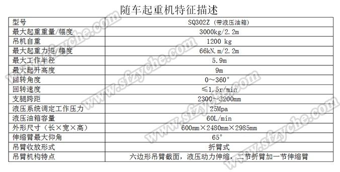 凈功率206kw; 起重機(jī)型號(hào)為:SQ302Z(帶液壓油箱),起重機(jī)質(zhì)量為:1200kg,最大額定超升載荷為:3000kg. 側(cè)防護(hù)金屬材料Q235斷面槽形,螺栓連接,斷面高度40mm,離地高度450mm; 后防護(hù)金屬材料Q235斷面槽形,螺栓連接,斷面高度135mm,離地高度500mm; 安裝具有衛(wèi)星定位功能行駛記錄儀,東風(fēng)越野隨車吊:www.ljbsdt.com 吊機(jī)詳細(xì)參數(shù):