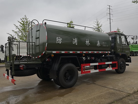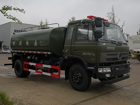 采用東風EQ2180GD5DJ型越野汽車底盤,東風一排半寬體駕駛室,4×4驅(qū)動,康明斯ISB190 50國五發(fā)動機,六檔變速箱,東風商用車橋,前驅(qū)動橋3.8噸,后橋10噸,10.00R20輪胎,軸距4500mm,電動玻璃,方向助力,斷氣剎,ABS。罐體采用優(yōu)質(zhì)碳鋼QB235板材,板材厚度4mm,罐體容積11.1立方,變速箱安裝取力器,大功率水泵可泵進泵出,后置工作平臺帶水炮射程25米,消防栓接口左右各一個,選裝駕駛室頂部安裝長條警燈帶喊話器,全車顏色軍綠,兩側(cè)噴涂白色森林消防字樣。