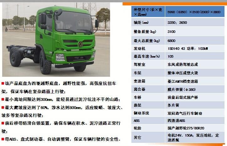 整車參數(shù):外型尺寸(長(zhǎng)×寬×高mm):5990(6350)×2100×2800,軸距(mm):3350;3650,輪距(F/R)(mm):1790 /1746 ,前懸/后懸(mm):1400/1240,1400/1300 ,最小離地間隙(滿載)(mm):≥300 ,接近角/離去角(°): 30/30 ,整備質(zhì)量(kg):4300,允許裝載質(zhì)量(kg):2500,最大總質(zhì)量(kg):6800,驅(qū)動(dòng)形式:4×4,最高車速(km/h):105。發(fā)動(dòng)機(jī)參數(shù):發(fā)動(dòng)機(jī):ISDe140 43,額定功率(kW/r/min):103/2500,最大扭矩(N.m/r/min):450/1400 ,排量(L):4.5。